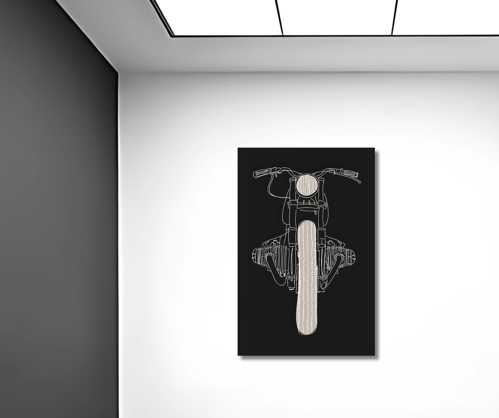 Diseño moderno en blanco y negro de una motocicleta frontal con trazos minimalistas.